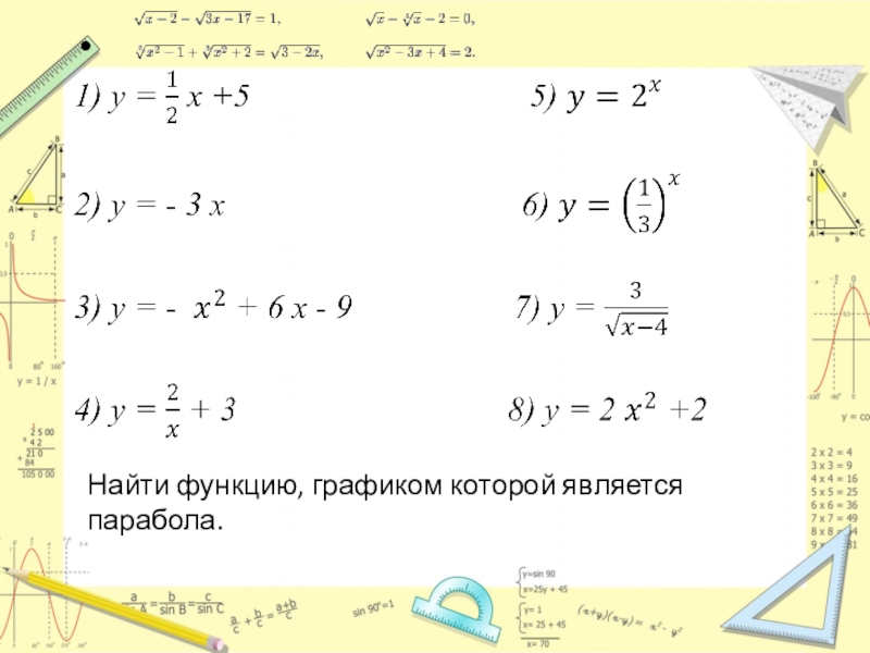 Слайд 6Найти функцию, графиком которой является парабола.
