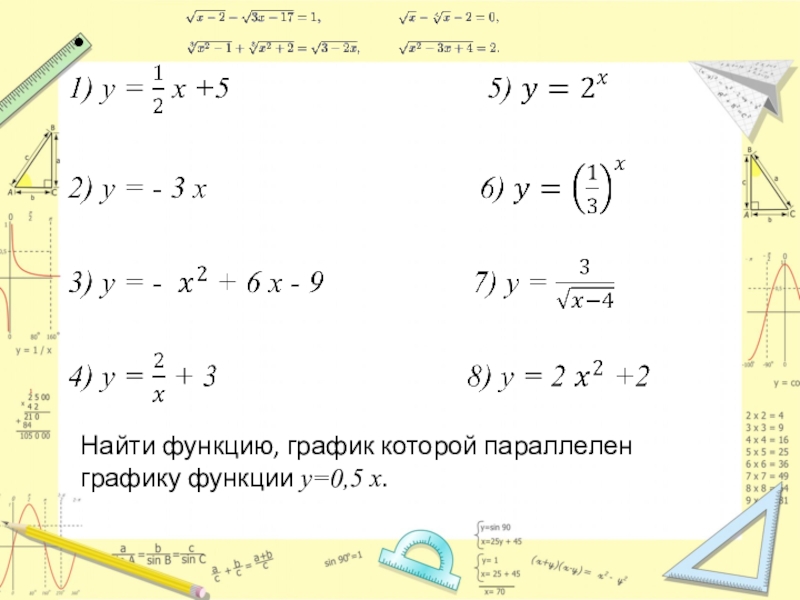 Слайд 4Найти функцию, график которой параллелен графику функции у=0,5 х.