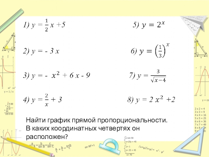 Слайд 8Найти график прямой пропорциональности.