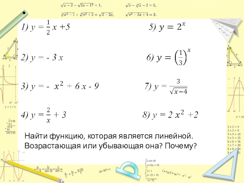 Слайд 3Найти функцию, которая является линейной. Возрастающая или убывающая она? Почему?