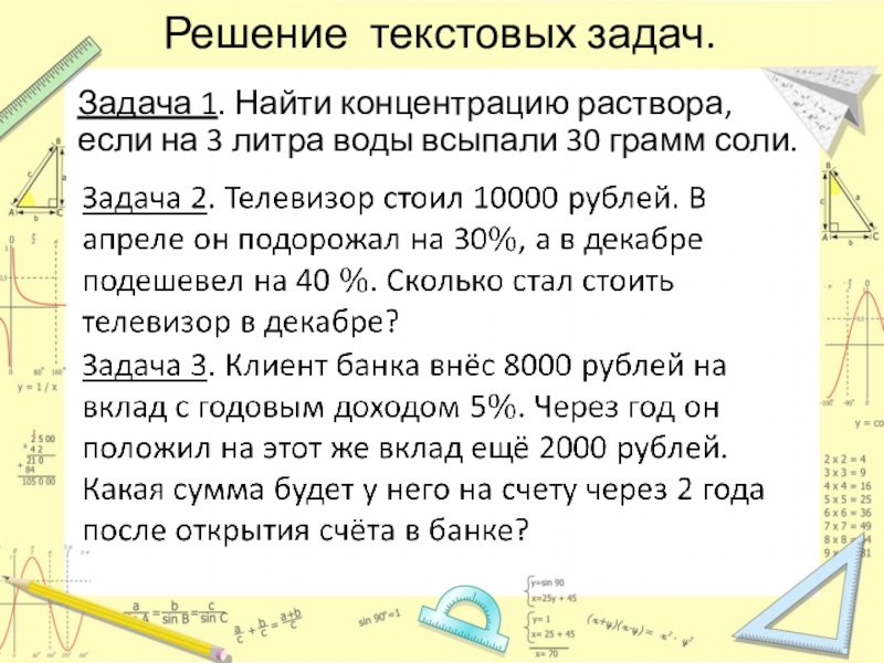 Решение текстовых задач.Задача 1. Найти концентрацию раствора, если на 3 литра воды всыпали 30 грамм соли.