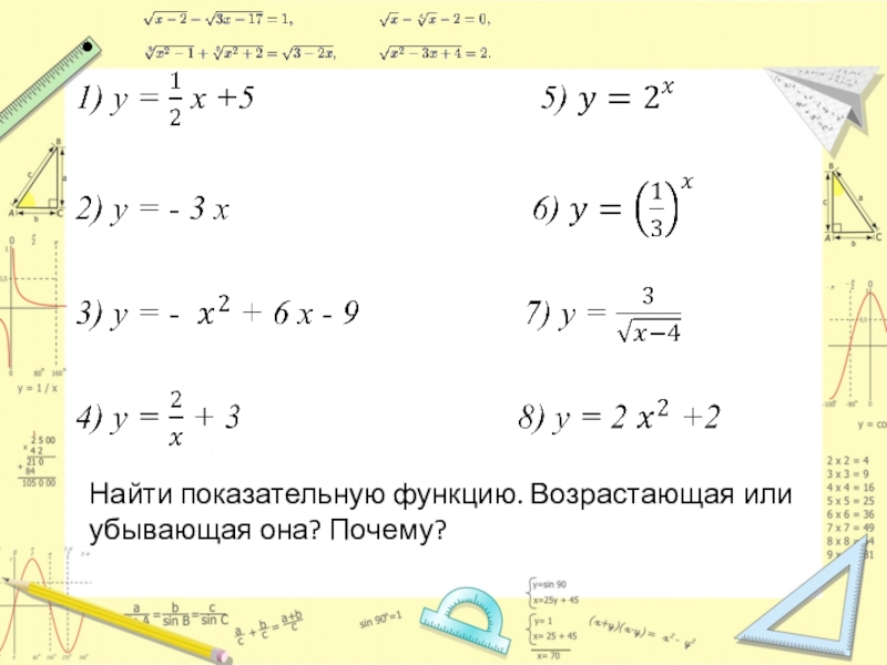 Слайд 5Найти показательную функцию. Возрастающая или убывающая она? Почему?