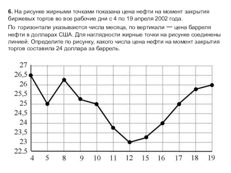 биржевых торгов во все рабочие дни с 4 по 19 апреля 2002 года. По горизонтали указываются числа месяца, по вертикали — цена барреля нефти в долларах США. Для наглядности жирные точки на рисунке соединены линией. Определите по рисунку, какого числа цена нефти на момент закрытия торгов составила 24 доллара за баррель.