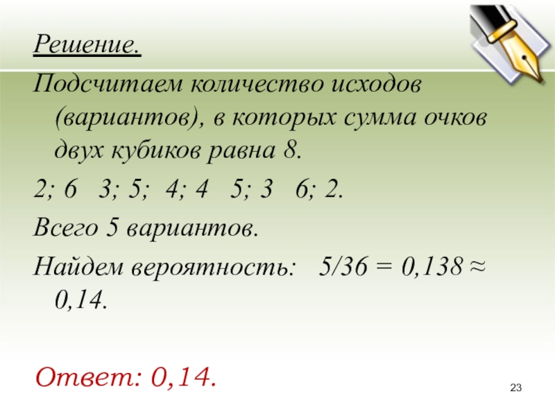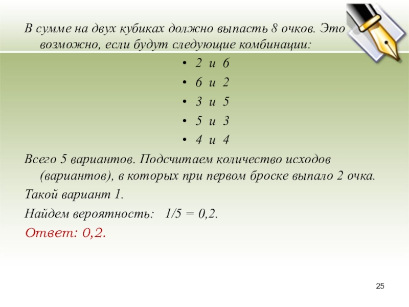 Слайд 25В сумме на двух кубиках должно выпасть 8 очков. Это возможно,