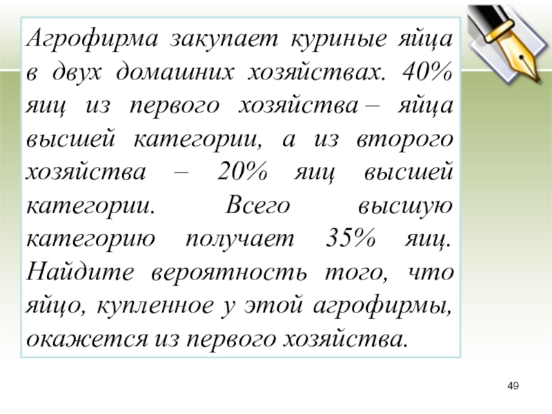 Слайд 49Агрофирма закупает куриные яйца в двух домашних хозяйствах. 40% яиц из