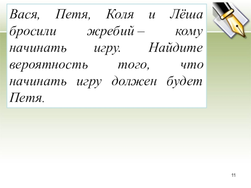 Слайд 11Вася, Петя, Коля и Лёша бросили жребий – кому начинать игру. Найдите