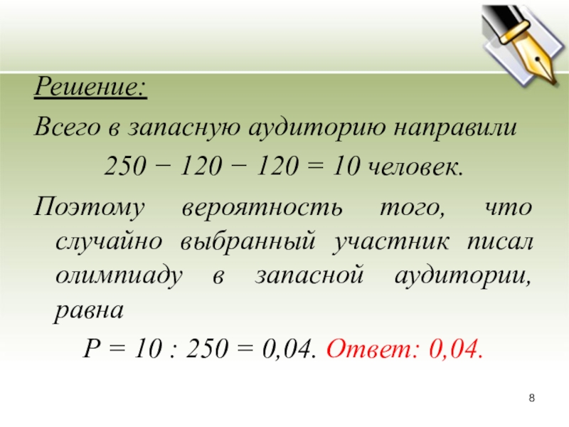 двух по 120 человек, оставшихся проводят в запасную аудиторию в другом корпусе. При подсчёте выяснилось, что всего было 250 участников. Найдите вероятность того, что случайно выбранный участник писал олимпиаду в запасной аудитории.