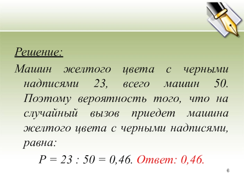 Поэтому вероятность того, что на случайный вызов приедет машина желтого цвета с черными надписями, равна:
