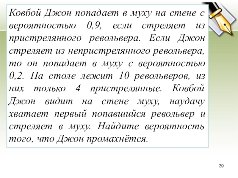Слайд 39Ковбой Джон попадает в муху на стене с вероятностью 0,9, если