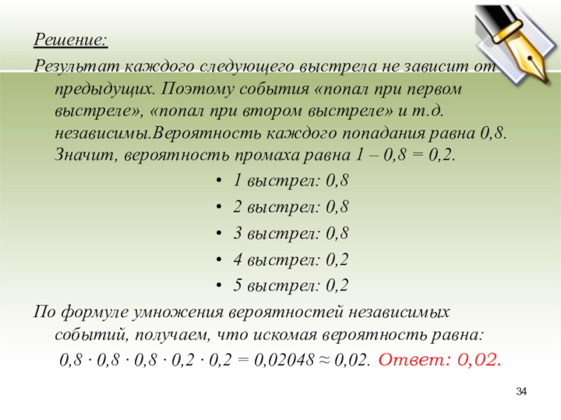 «попал при первом выстреле», «попал при втором выстреле» и т.д. независимы.Вероятность каждого попадания равна 0,8. Значит, вероятность промаха равна 1 – 0,8 = 0,2.