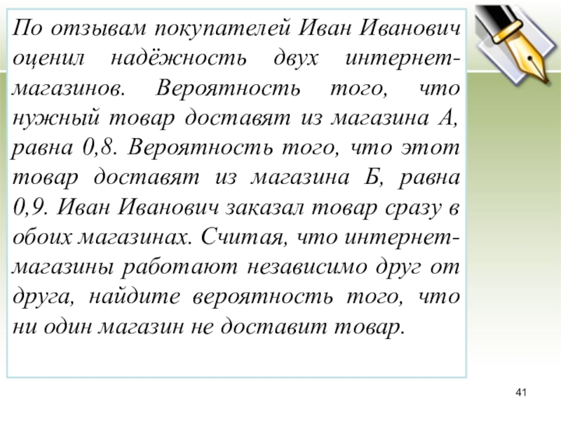 Слайд 41По отзывам покупателей Иван Иванович оценил надёжность двух интернет-магазинов. Вероятность того,