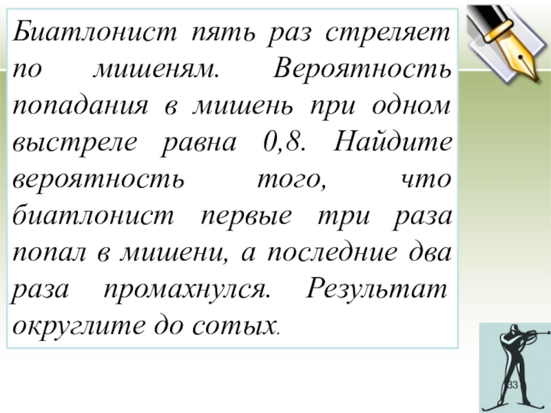 Слайд 33Биатлонист пять раз стреляет по мишеням. Вероятность попадания в мишень при