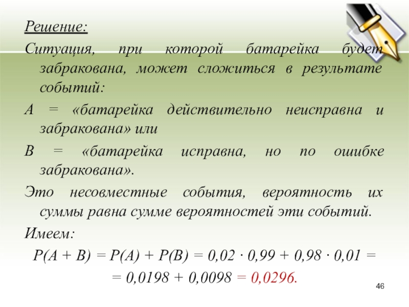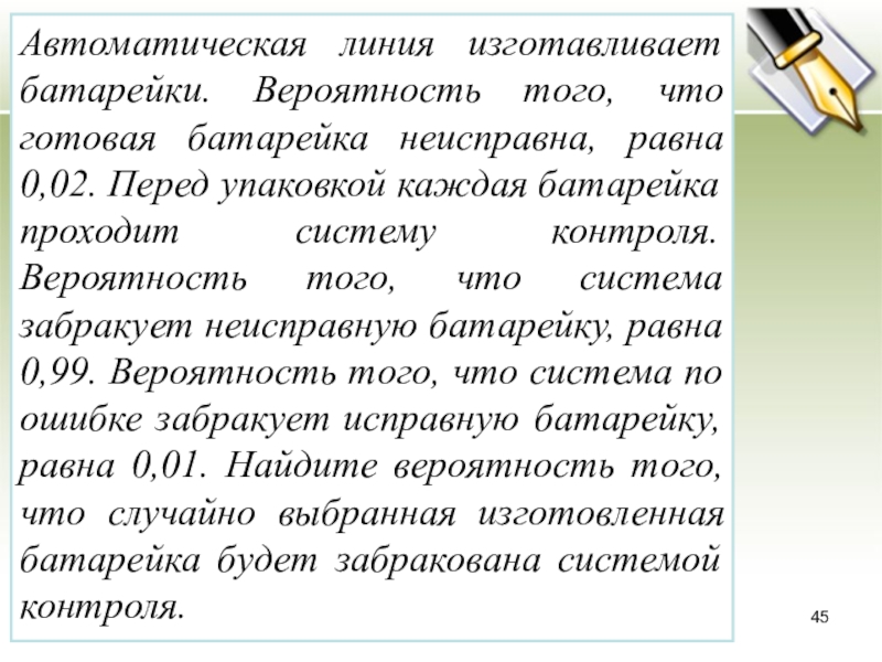 Слайд 45Автоматическая линия изготавливает батарейки. Вероятность того, что готовая батарейка неисправна, равна
