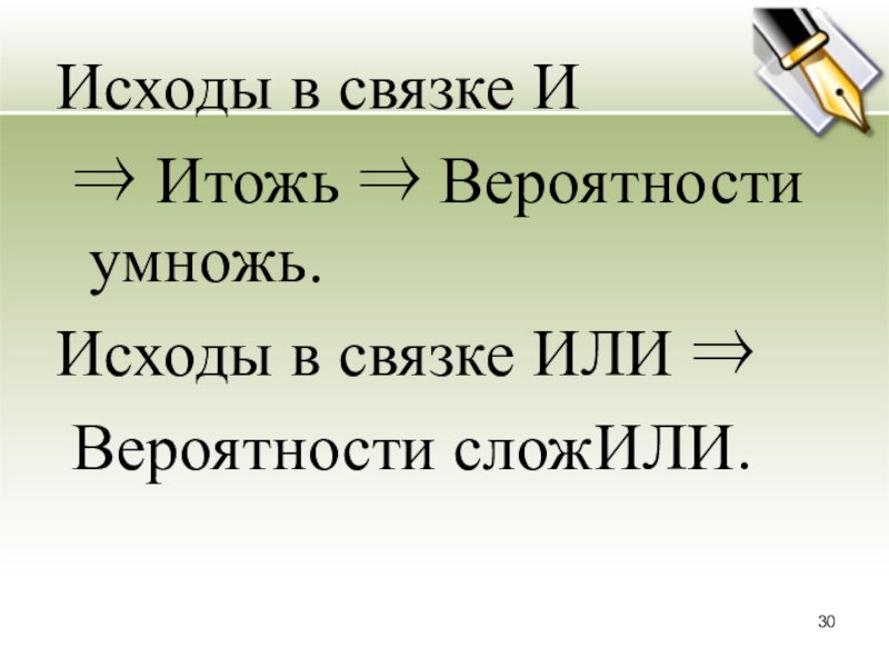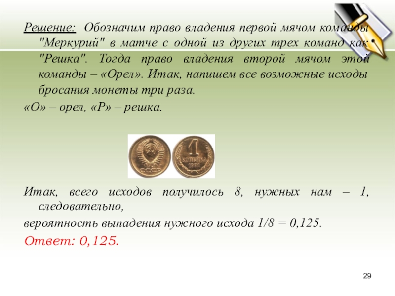 Слайд 29Решение: Обозначим право владения первой мячом команды "Меркурий" в матче с