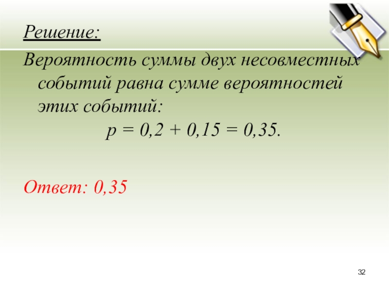 Указанные события несовместные, вероятность их суммы равна сумме вероятностей этих событий: