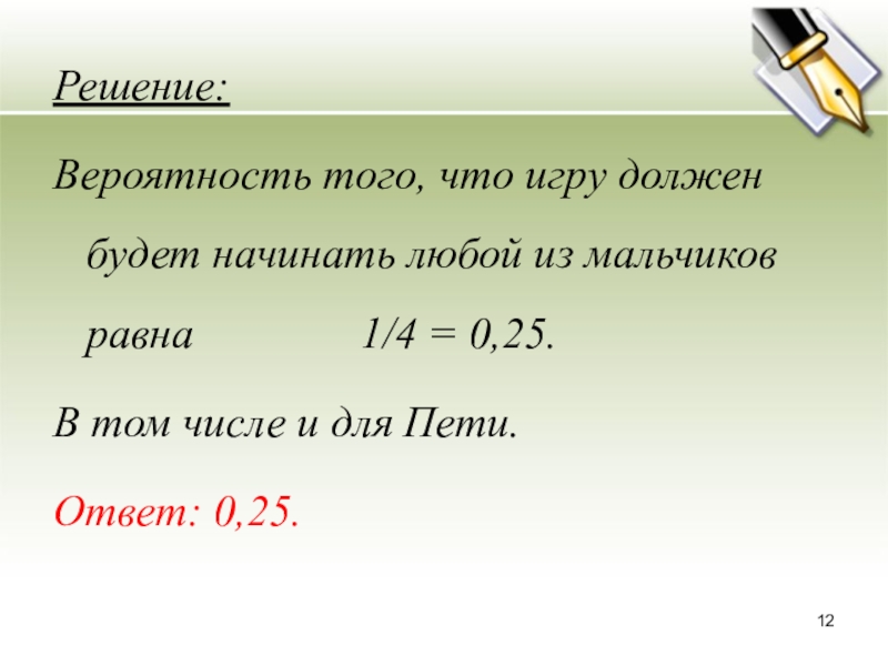 Вероятность того, что игру должен будет начинать любой из мальчиков
