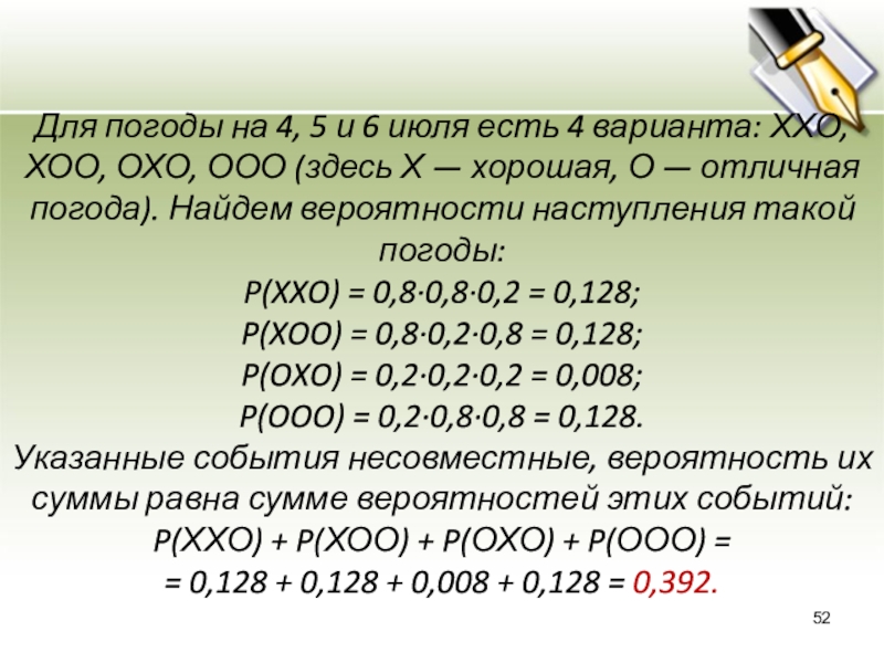 ХХО, ХОО, ОХО, ООО (здесь Х — хорошая, О — отличная погода). Найдем вероятности наступления такой погоды: