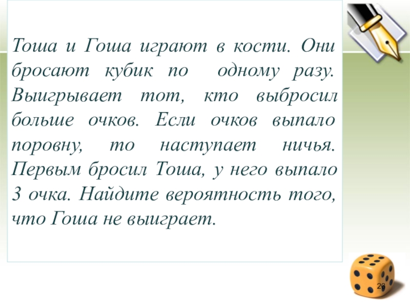 Слайд 26Тоша и Гоша играют в кости. Они бросают кубик по одному