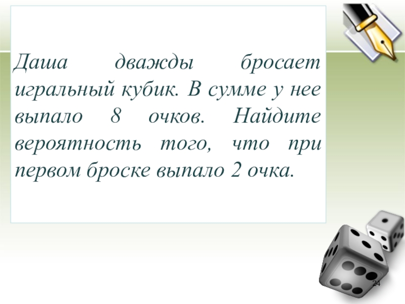 Слайд 24Даша дважды бросает игральный кубик. В сумме у нее выпало 8