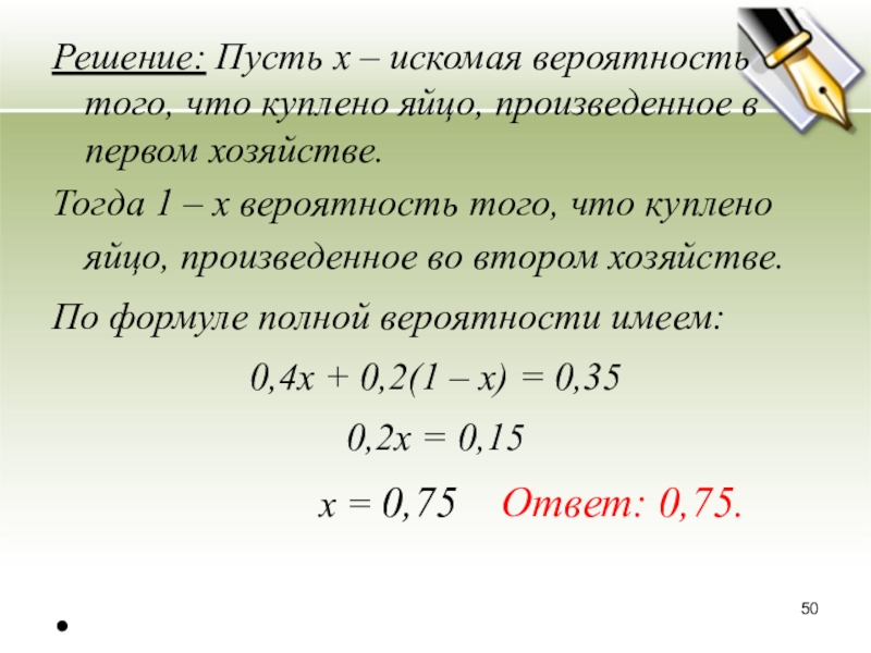 Слайд 50Решение: Пусть х – искомая вероятность того, что куплено яйцо, произведенное