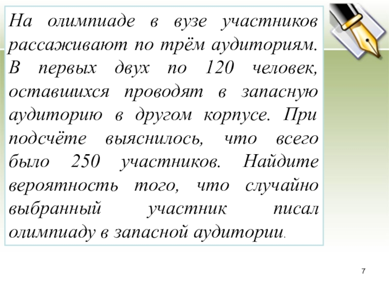 Слайд 7На олимпиаде в вузе участников рассаживают по трём аудиториям. В первых
