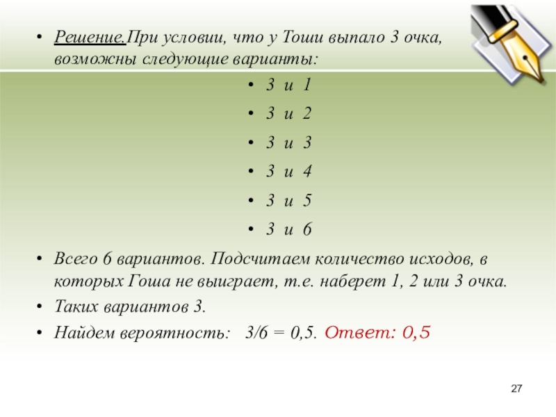 Слайд 27Решение.При условии, что у Тоши выпало 3 очка, возможны следующие варианты: