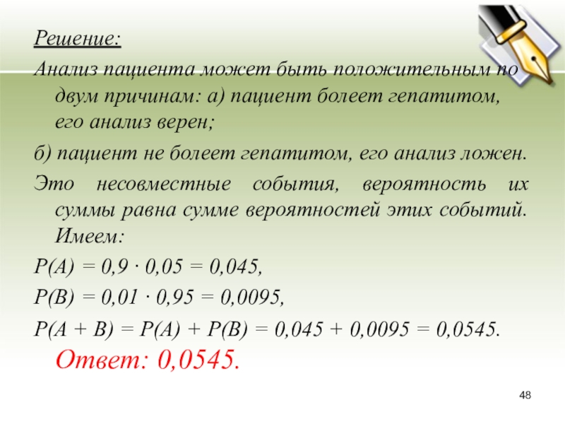 выявляет гепатит, то результат анализа называется положительным. У больных гепатитом пациентов анализ даёт положительный результат с вероятностью 0,9. Если пациент не болен гепатитом, то анализ может дать ложный положительный результат с вероятностью 0,01. Известно, что 5% пациентов, поступающих с подозрением на гепатит, действительно больны гепатитом. Найдите вероятность того, что результат анализа у пациента, поступившего в клинику с подозрением на гепатит, будет положительным.