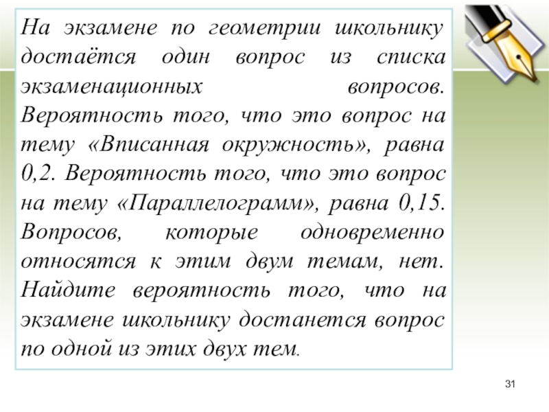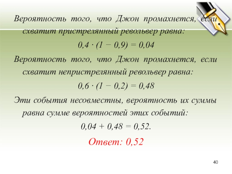 Слайд 40Вероятность того, что Джон промахнется, если схватит пристрелянный револьвер равна: