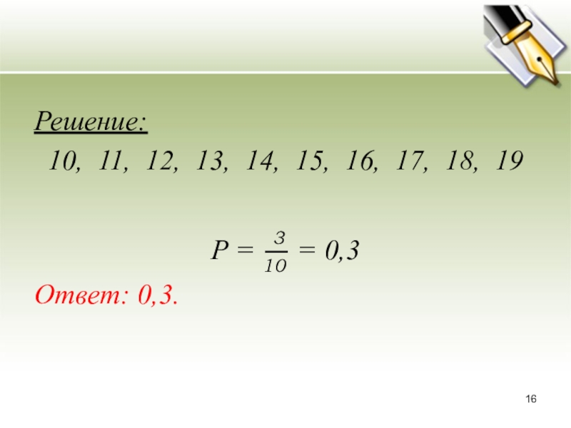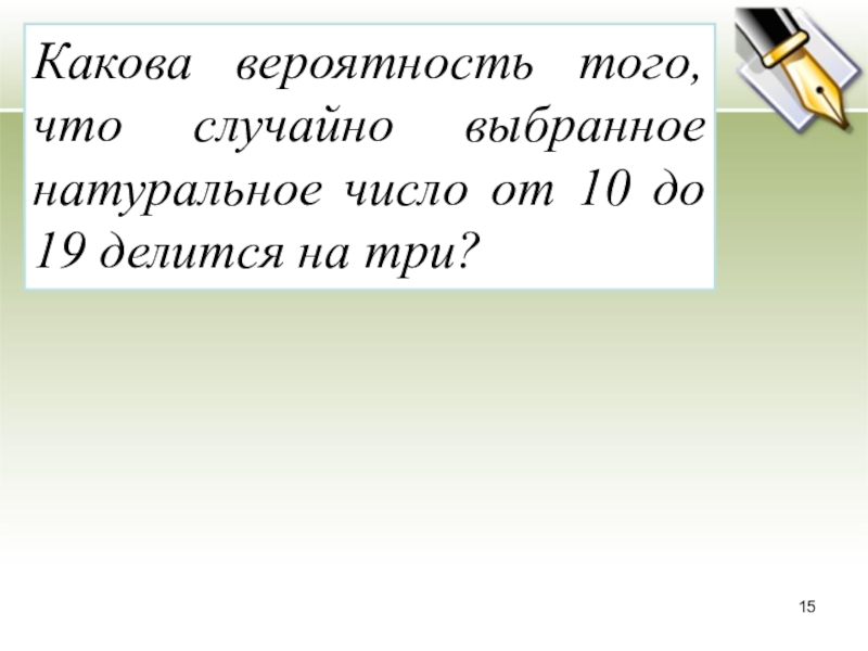 Слайд 15Какова вероятность того, что случайно выбранное натуральное число от 10 до