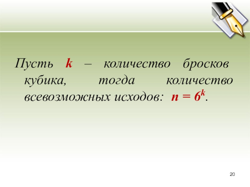 Пусть k – количество бросков кубика, тогда количество всевозможных исходов: n
