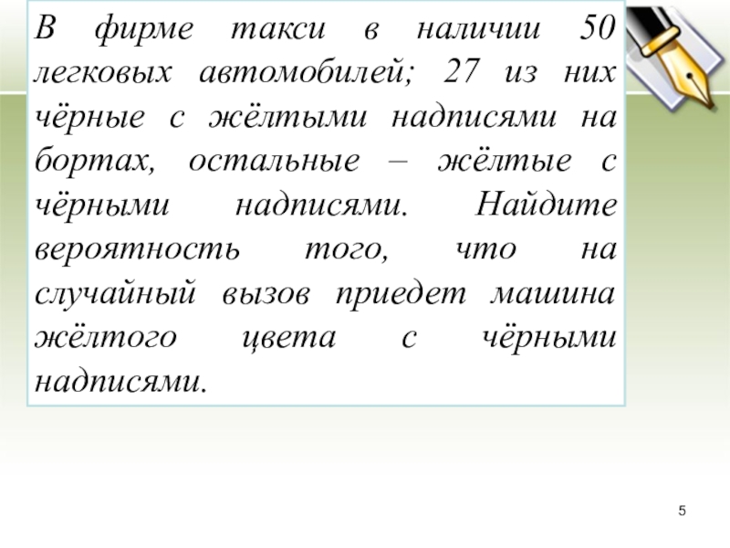 Слайд 5В фирме такси в наличии 50 легковых автомобилей; 27 из них