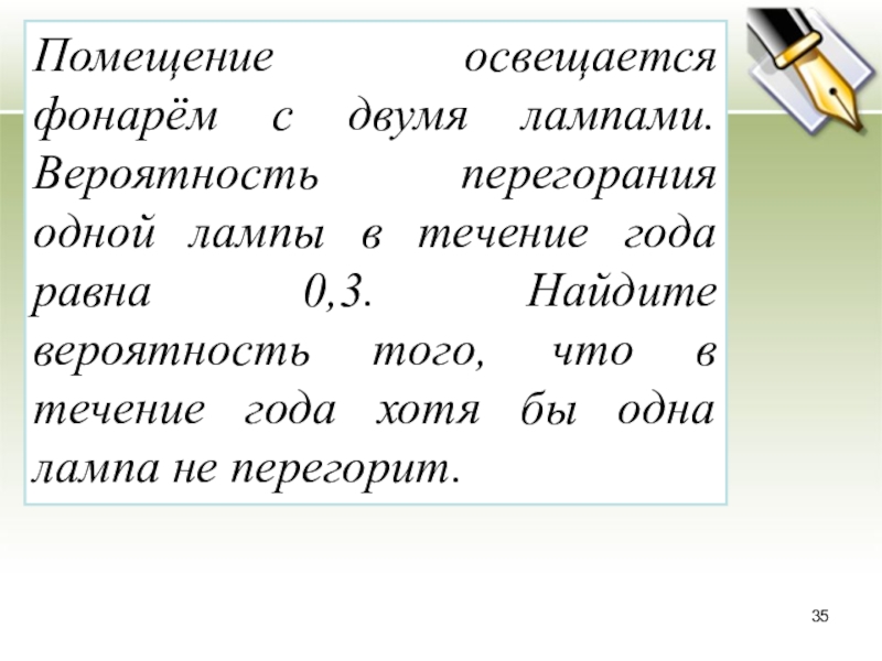 Слайд 35Помещение освещается фонарём с двумя лампами. Вероятность перегорания одной лампы в