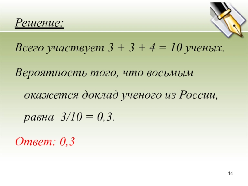 Вероятность того, что восьмым окажется доклад ученого из России, равна 3/10 = 0,3.