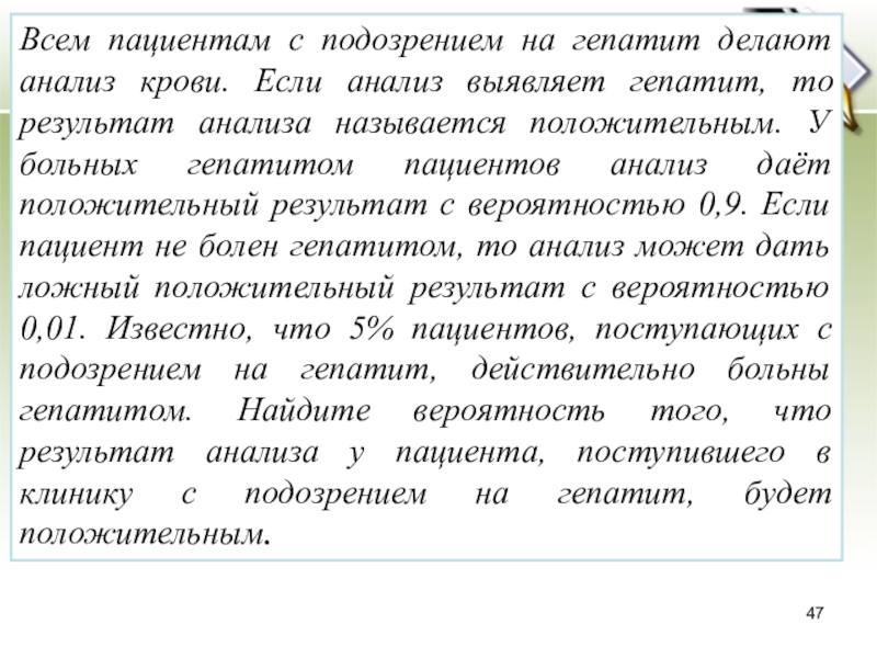 Слайд 47Всем пациентам с подозрением на гепатит делают анализ крови. Если анализ