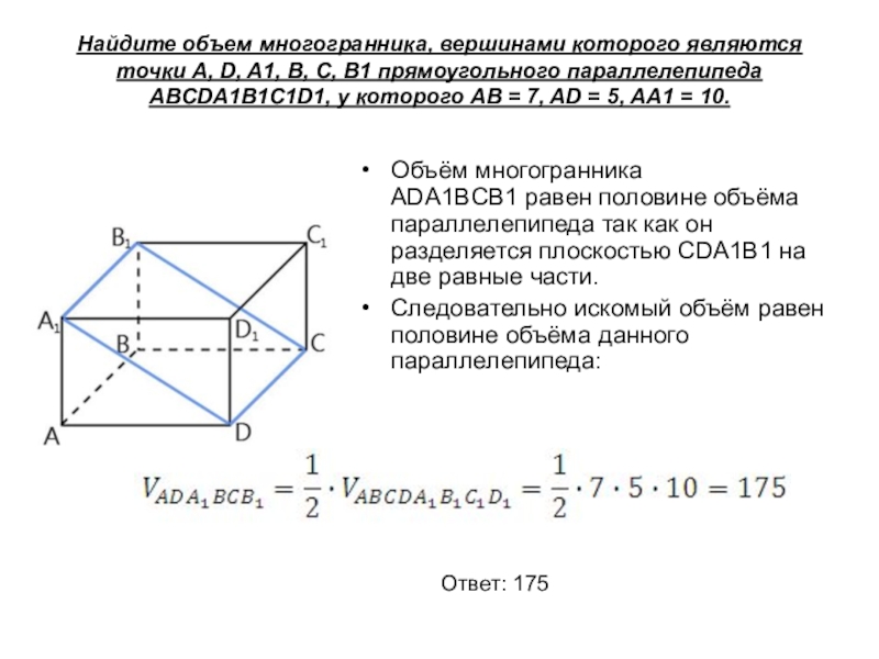 Объём многогранника ADA1BCB1 равен половине объёма параллелепипеда так как он разделяется плоскостью CDA1B1 на две равные части.