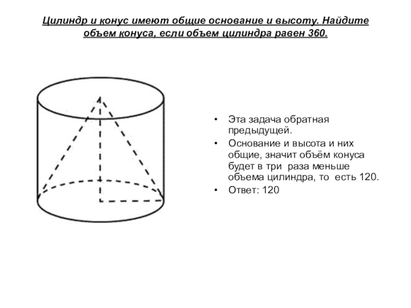 Поскольку они имеют общее основание и высоту, получается, что объем цилиндра будет в три раза больше объема конуса.