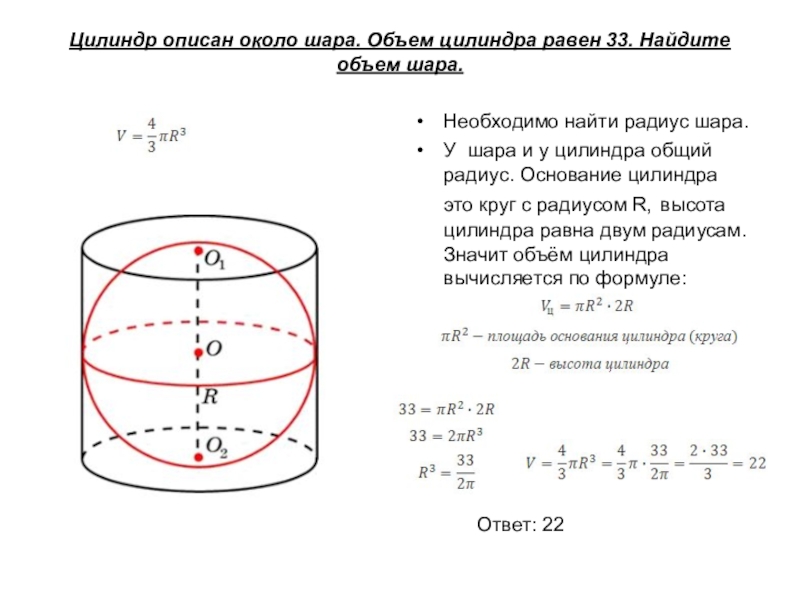 Цилиндр описан около шара. Объем цилиндра равен 33. Найдите объем шара.