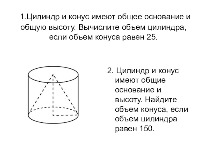 2. Цилиндр и конус имеют общие основание и высоту. Найдите объем конуса, если объем цилиндра равен 150.