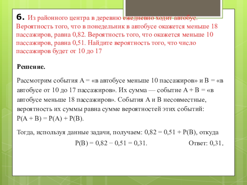 Рассмотрим события A = «в автобусе меньше 10 пассажиров» и В = «в автобусе от 10 до 17 пассажиров». Их сумма — событие A + B = «в автобусе меньше 18 пассажиров». События A и В несовместные, вероятность их суммы равна сумме вероятностей этих событий: P(A + B) = P(A) + P(B).