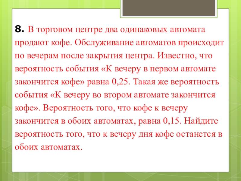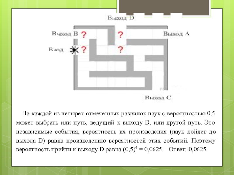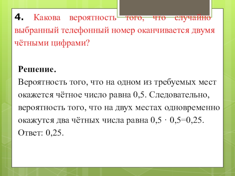 Вероятность того, что на одном из требуемых мест окажется чётное число равна 0,5. Следовательно, вероятность того, что на двух местах одновременно окажутся два чётных числа равна 0,5 · 0,5=0,25. Ответ: 0,25.