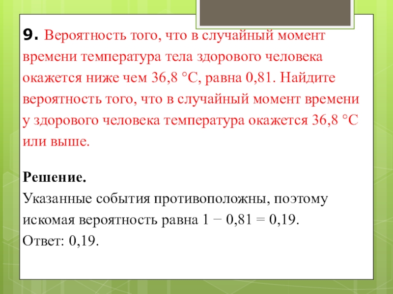 Указанные события противоположны, поэтому искомая вероятность равна 1 − 0,81 = 0,19. Ответ: 0,19.