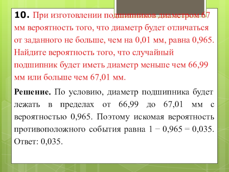 Решение. По условию, диаметр подшипника будет лежать в пределах от 66,99 до 67,01 мм с вероятностью 0,965. Поэтому искомая вероятность противоположного события равна 1 − 0,965 = 0,035. Ответ: 0,035.
