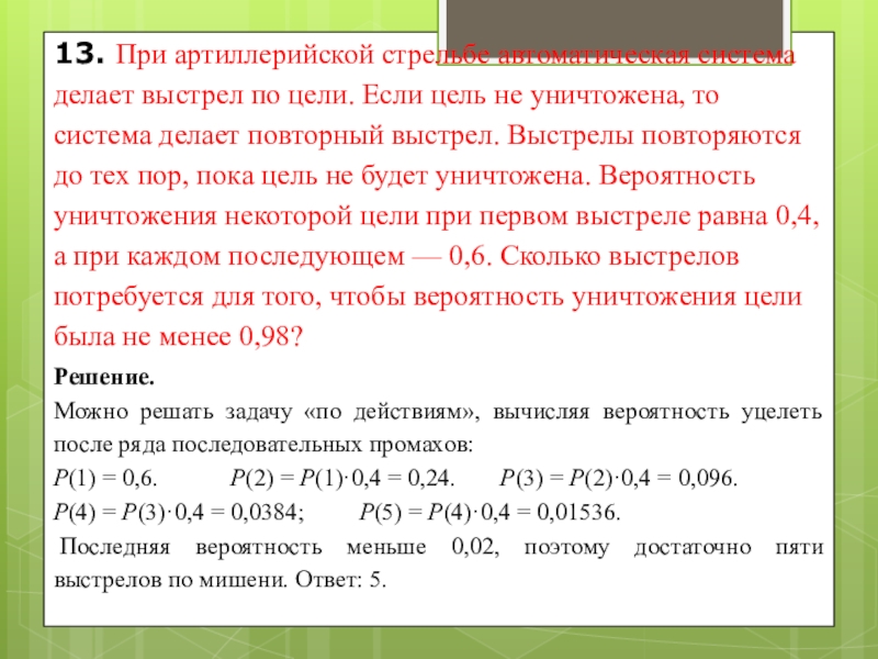 Можно решать задачу «по действиям», вычисляя вероятность уцелеть после ряда последовательных промахов: