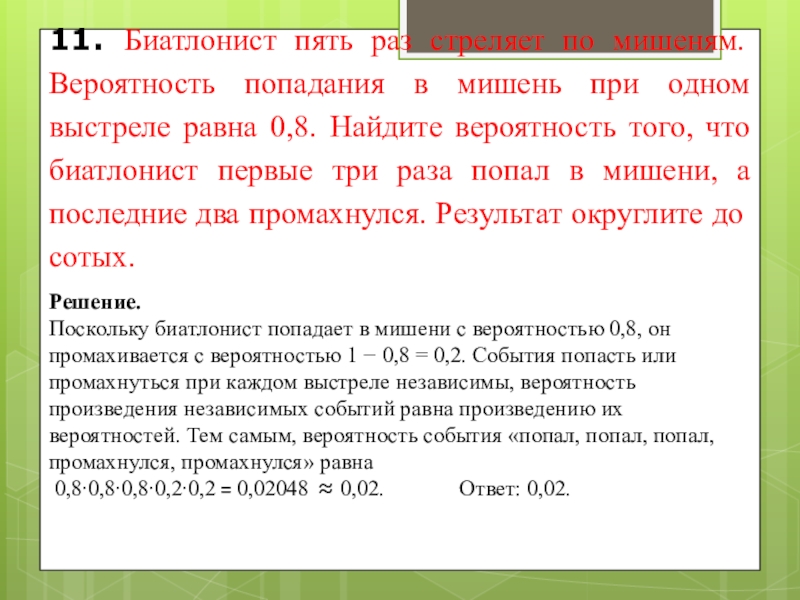 Поскольку биатлонист попадает в мишени с вероятностью 0,8, он промахивается с вероятностью 1 − 0,8 = 0,2. Cобытия попасть или промахнуться при каждом выстреле независимы, вероятность произведения независимых событий равна произведению их вероятностей. Тем самым, вероятность события «попал, попал, попал, промахнулся, промахнулся» равна