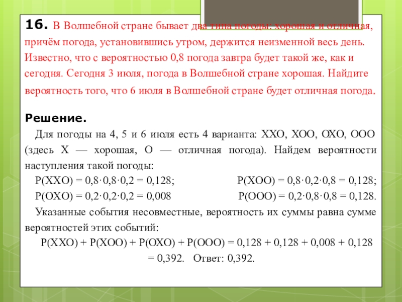 Для погоды на 4, 5 и 6 июля есть 4 варианта: ХХО, ХОО, ОХО, ООО (здесь Х — хорошая, О — отличная погода). Найдем вероятности наступления такой погоды: