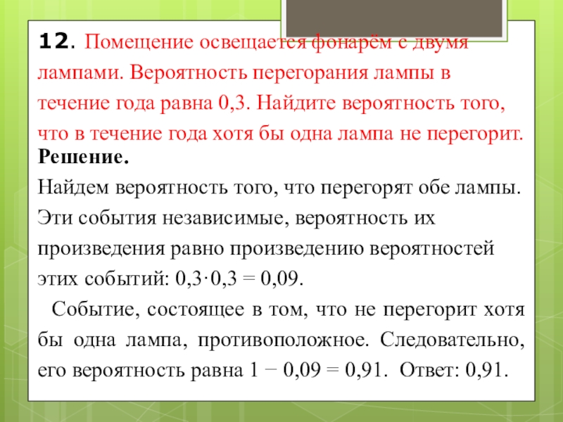 Событие, состоящее в том, что не перегорит хотя бы одна лампа, противоположное. Следовательно, его вероятность равна 1 − 0,09 = 0,91. Ответ: 0,91.