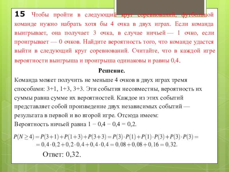 Команда может получить не меньше 4 очков в двух играх тремя способами: 3+1, 1+3, 3+3. Эти события несовместны, вероятность их суммы равна сумме их вероятностей. Каждое из этих событий представляет собой произведение двух независимых событий — результата в первой и во второй игре. Отсюда имеем:
