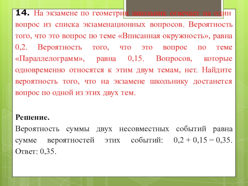 Вероятность суммы двух несовместных событий равна сумме вероятностей этих событий: 0,2 + 0,15 = 0,35. Ответ: 0,35.
