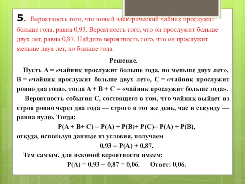 Пусть A = «чайник прослужит больше года, но меньше двух лет», В = «чайник прослужит больше двух лет», С = «чайник прослужит ровно два года», тогда A + B + С = «чайник прослужит больше года».