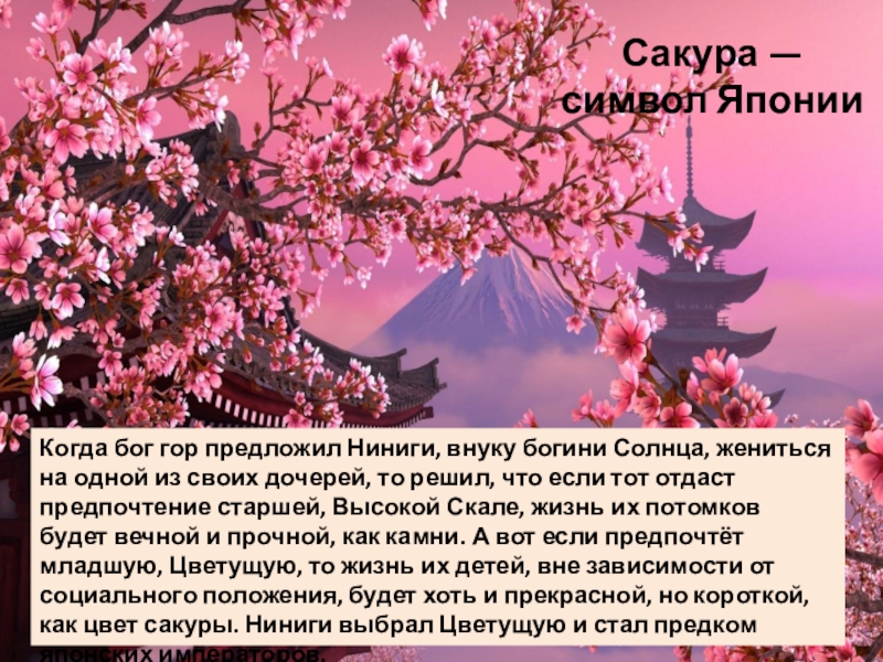 жениться на одной из своих дочерей, то решил, что если тот отдаст предпочтение старшей, Высокой Скале, жизнь их потомков будет вечной и прочной, как камни. А вот если предпочтёт младшую, Цветущую, то жизнь их детей, вне зависимости от социального положения, будет хоть и прекрасной, но короткой, как цвет сакуры. Ниниги выбрал Цветущую и стал предком японских императоров.